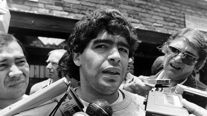 Diego Maradona Argentinian footballer talking to the press during the 1986 World Cup. Picture: Getty