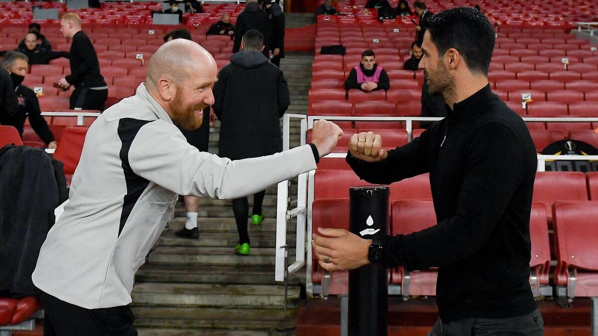 Dundalk coach Shane Keegan and Arsenal manager Mikel Arteta. Photo by Ben McShane/Sportsfile