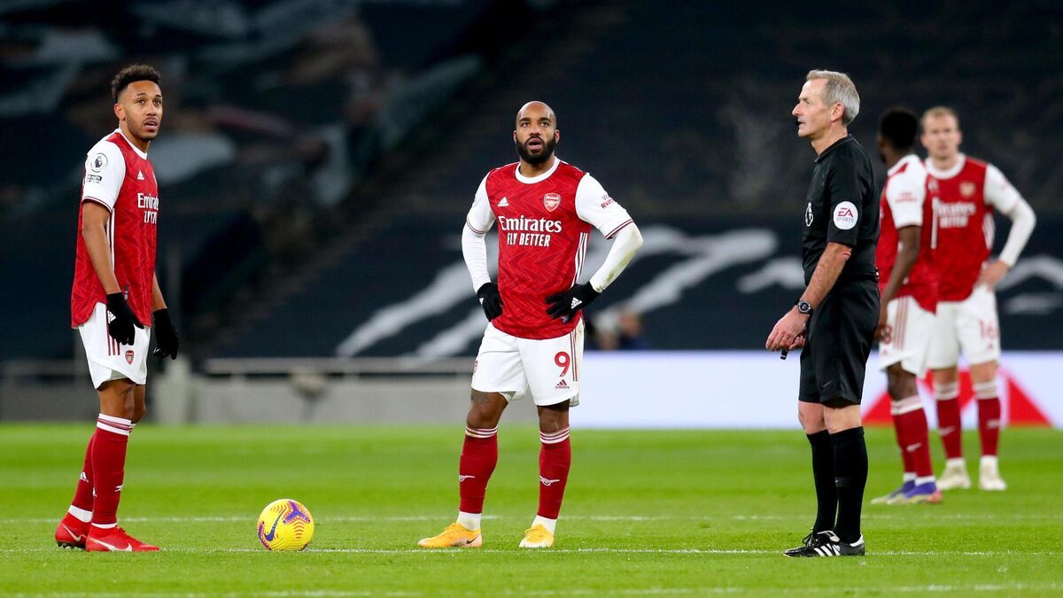 Pierre-Emerick Aubameyang, left, and Alexandre Lacazette appear dejected during Arsenal’s derby defeat by Tottenham (Catherine Ivill/PA)