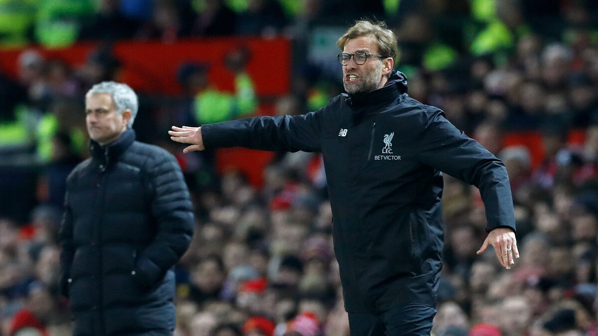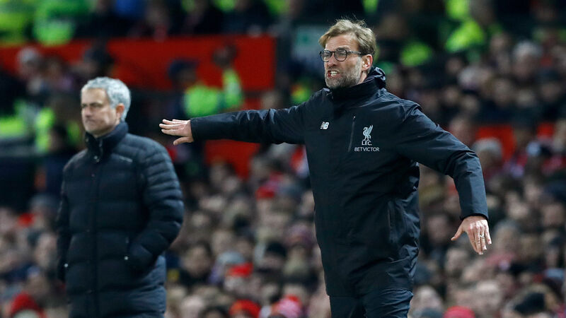 Jose Mourinho, left, and Jurgen Klopp are vying to be first in the Premier League. Picture: Martin Rickett/PA