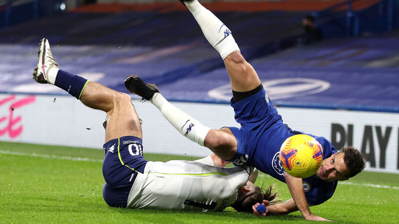 EYE ON THE BALL: Aston Villa’s Jack Grealish tumbles after a challenge from Chelsea’s Cesar Azpilicueta during the Premier League clash at Stamford Bridge. Picture: Catherine Ivill/PA Wire