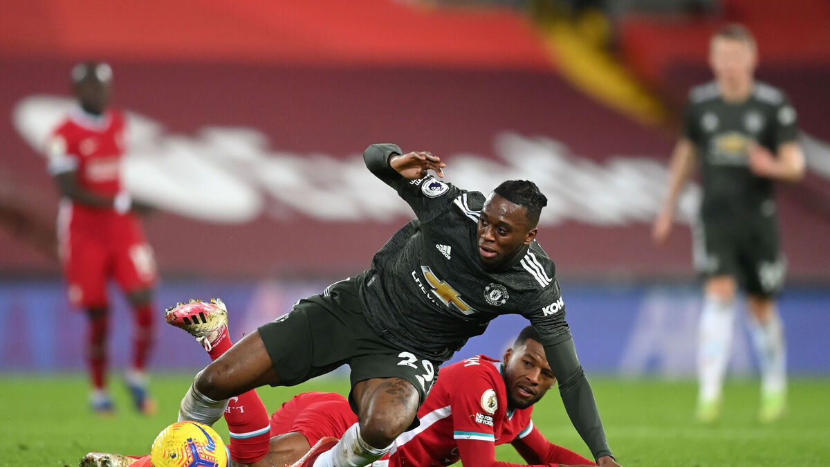 Manchester United's Aaron Wan-Bissaka and Liverpool's Georginio Wijnaldum battle for the ball during the Premier League match at Anfield. Picture: Michael Regan
