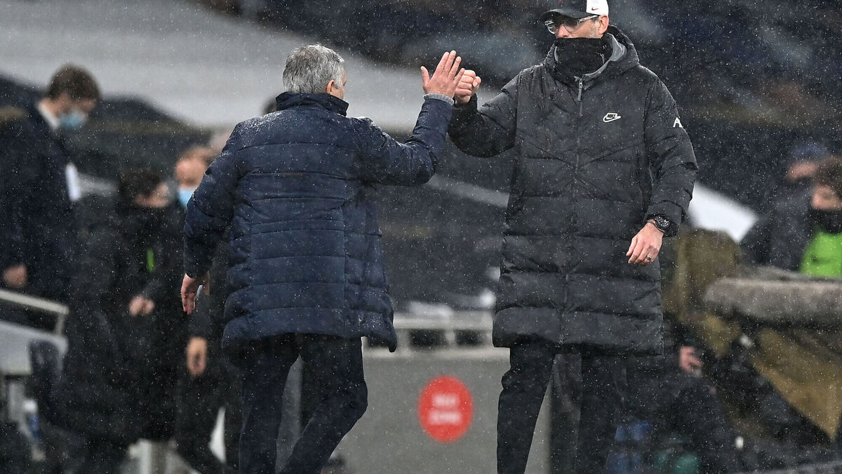 Liverpool manager Jurgen Klopp, right, with Tottenham boss Jose Mourinho at the final whistle. Picture: Shaun Botterill/PA