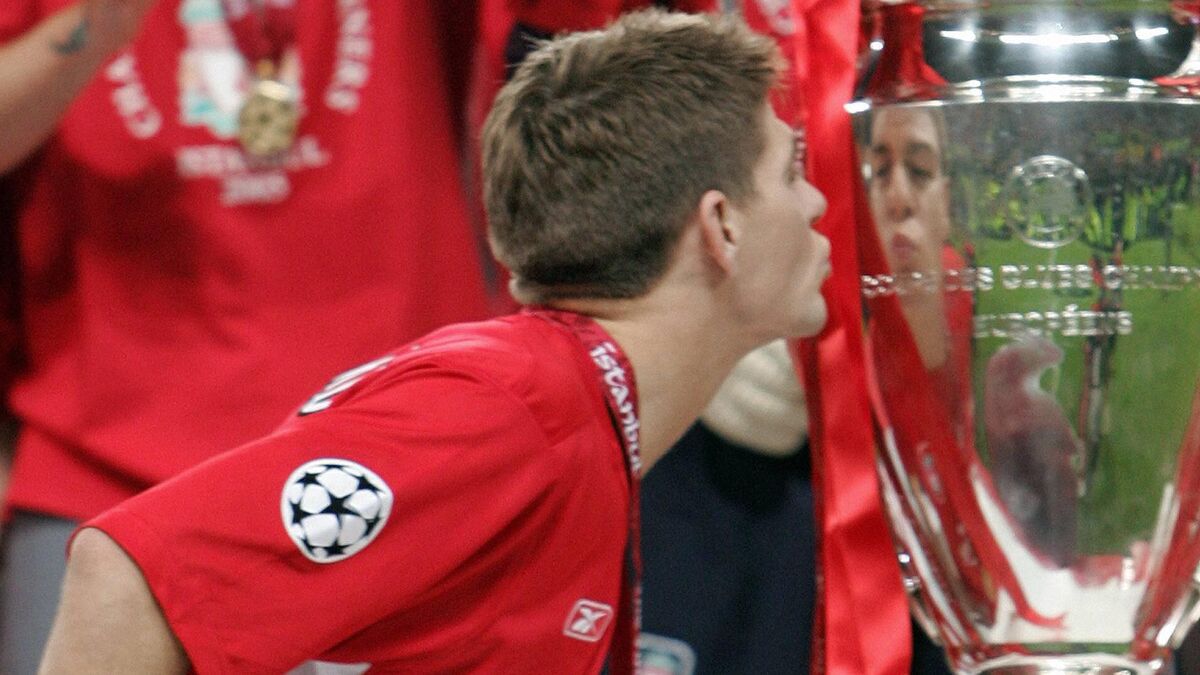 Liverpool's captain Steven Gerrard kisses the trophy surrounded by teammates at the end of the 2005 Champions League final win over AC Milan. Picture: Getty Images