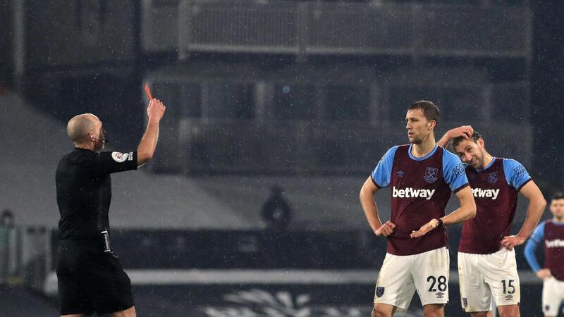 Match referee Mike Dean shows West Ham United's Tomas Soucek a red card for violent conduct during the Premier League match at Craven Cottage, London. Picture date: Saturday February 6, 2021.