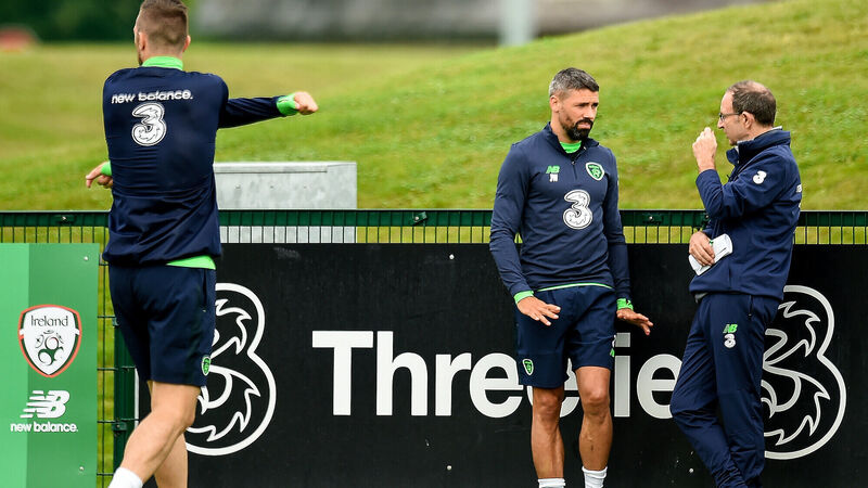 Republic of Ireland manager Martin O'Neil speaking to Jon Walters during a training session at Abbotstown in 2017. Picture: Eóin Noonan/Sportsfile