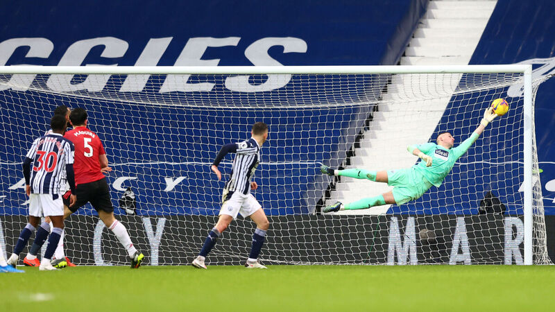 West Bromwich Albion goalkeeper Sam Johnstone (right) saves a shot from Manchester United's Harry Maguire at The Hawthorns. Picture: Michael Steele/PA