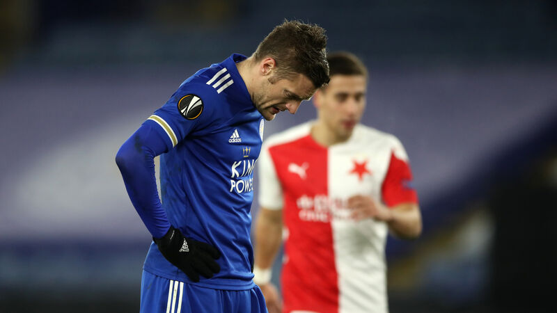 Jamie Vardy was left dejected as Leicester were knocked out of the Europa League. Picture: Nick Potts