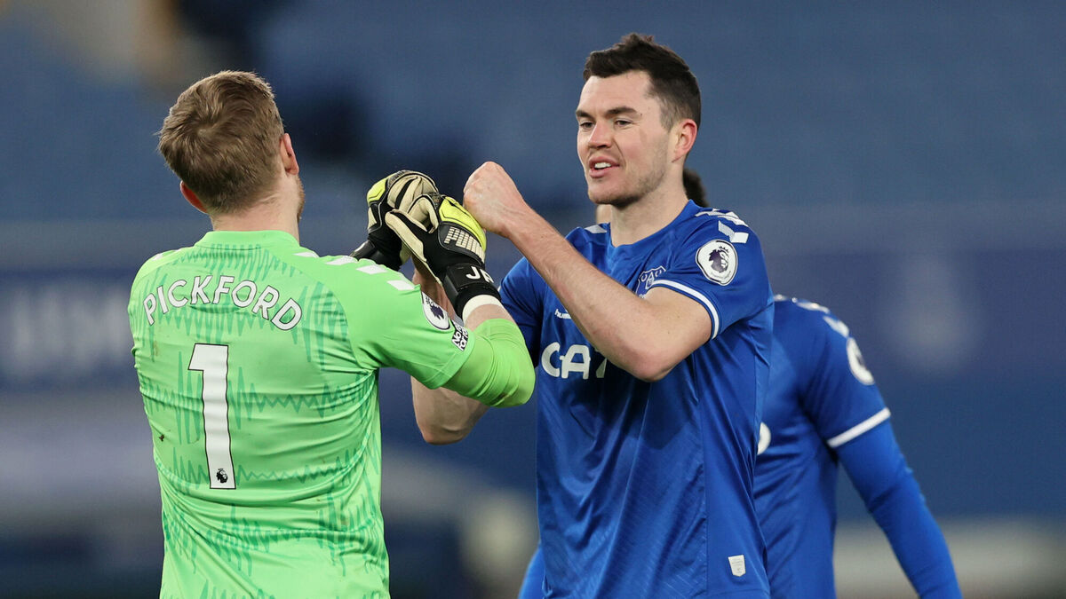 Everton's Jordan Pickford and Michael Keane celebrate victory at Goodison Park. Picture: Clive Brunskill/PA