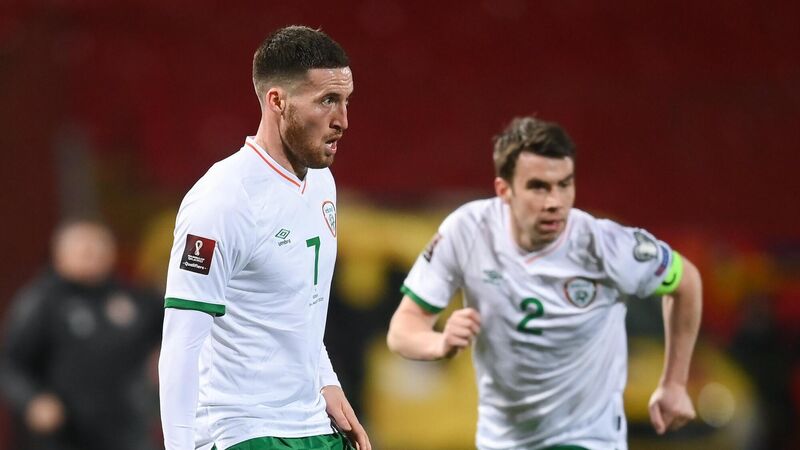 Matt Doherty, left, and Seamus Coleman of Republic of Ireland during the FIFA World Cup 2022 qualifying group A match between Serbia and Republic of Ireland at Stadion Rajko Mitic in Belgrade, Serbia. Photo by Stephen McCarthy/Sportsfile
