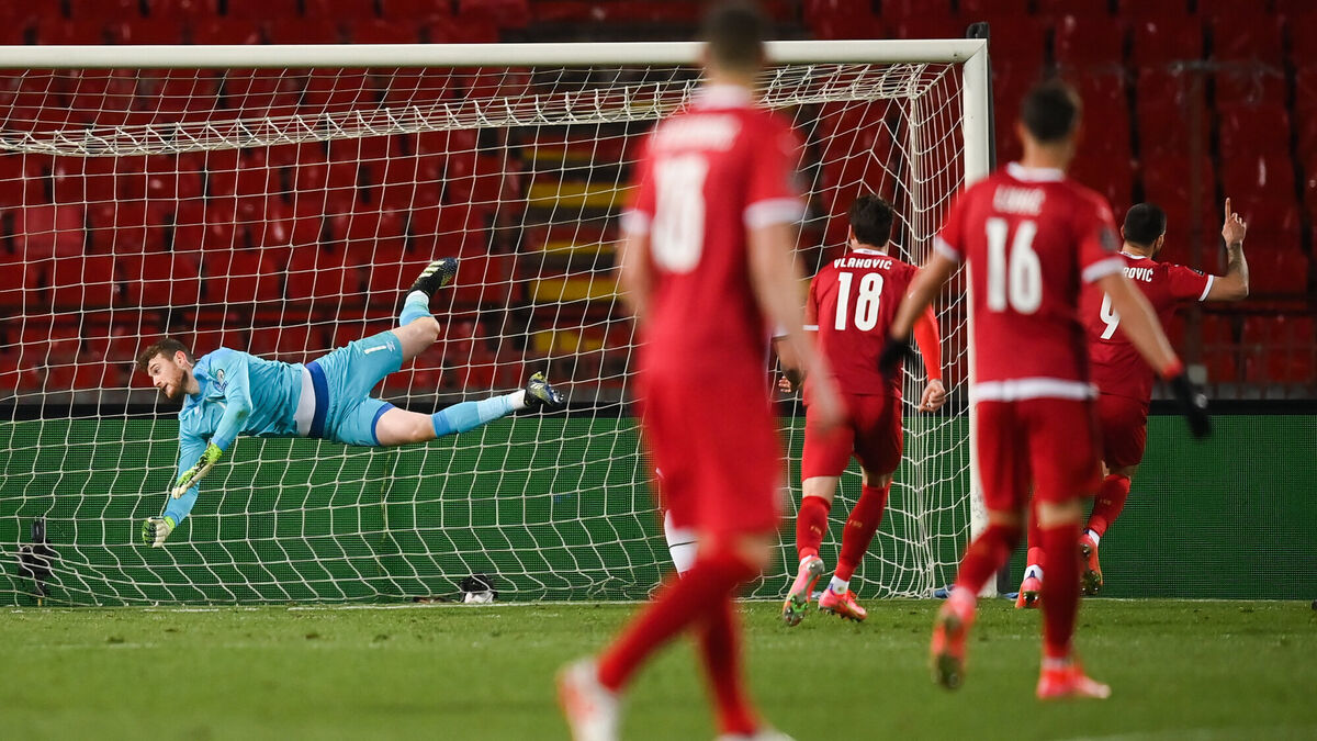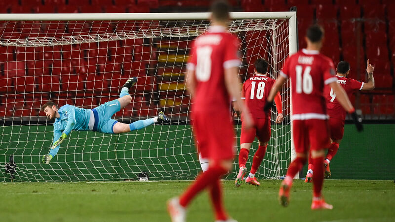 Republic of Ireland goalkeeper Mark Travers fails to stop the header of Aleksandar Mitrovic of Serbia, to score their side's third goal in the 3-2 win. Picture: Stephen McCarthy/Sportsfile