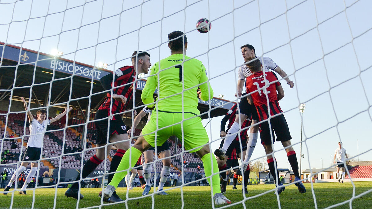 Garry Buckley heads in Sligo Rovers' winner against Longford Town at Bishopsgate. Photo by Harry Murphy/Sportsfile