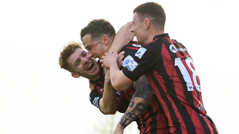 Rob Cornwall celebrates after scoring Bohemians' winning goal with team-mates Rory Feely, left, and James Finnerty at the RSC. Photo by Eóin Noonan/Sportsfile