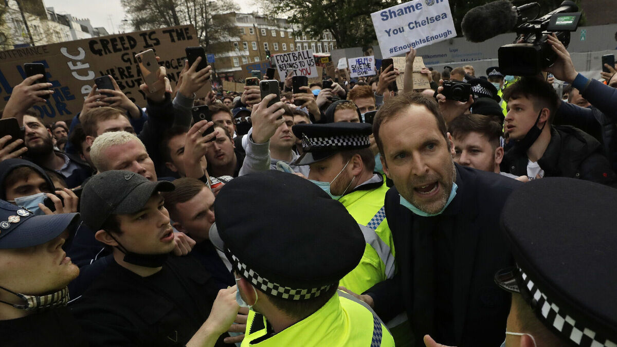 Chelsea former star goalkeeper Petr Cech, at right, behind a line of policemen, tries to calm down fans protesting outside Stamford Bridge stadium in London, against Chelsea's decision to be included amongst the clubs attempting to form a new European Super League. Picture: Matt Dunham