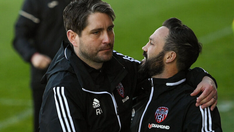 Derry City manager Ruaidhri Higgins celebrates with coach Raffaele Cretaro after the SSE Airtricity League Premier Division win over Sligo Rovers