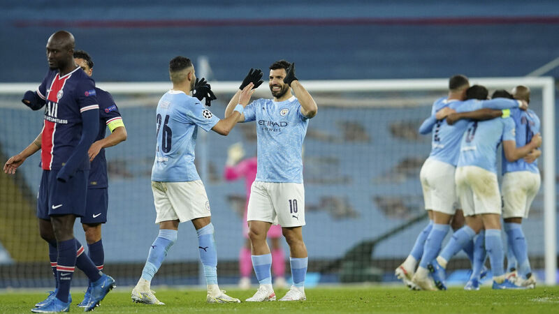 Manchester City's players celebrate after winning the Champions League semi-final clash with Paris Saint Germain. Picture :AP Photo/Dave Thompson