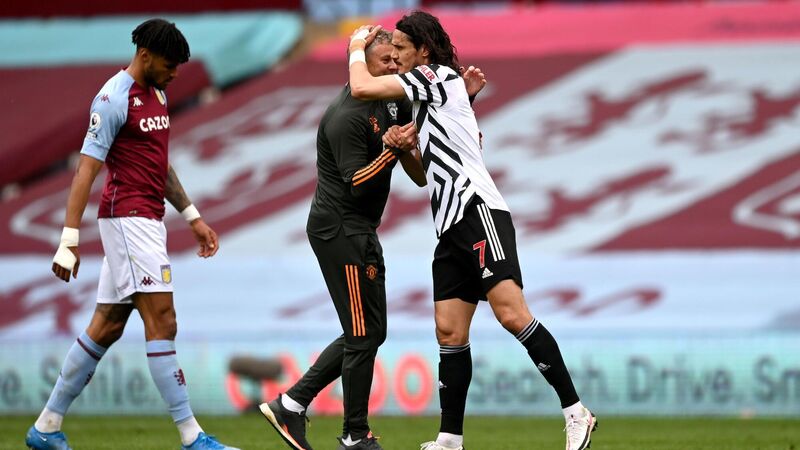 ROTATING: Man Utd boss Ole Gunnar Solskjaer celebrates with Edinson Cavani after the 2-1 win at Villa Park.