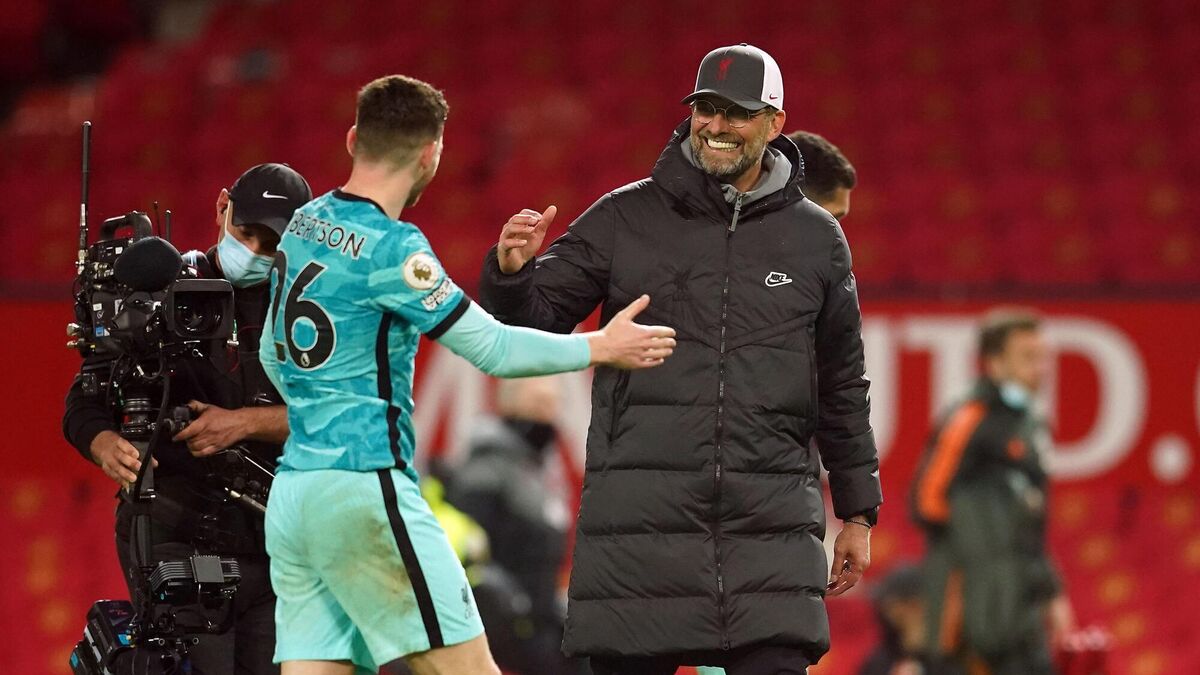 Liverpool manager Jurgen Klopp and Andrew Robertson celebrate after Thursday night's win over Liverpool at Old Trafford.