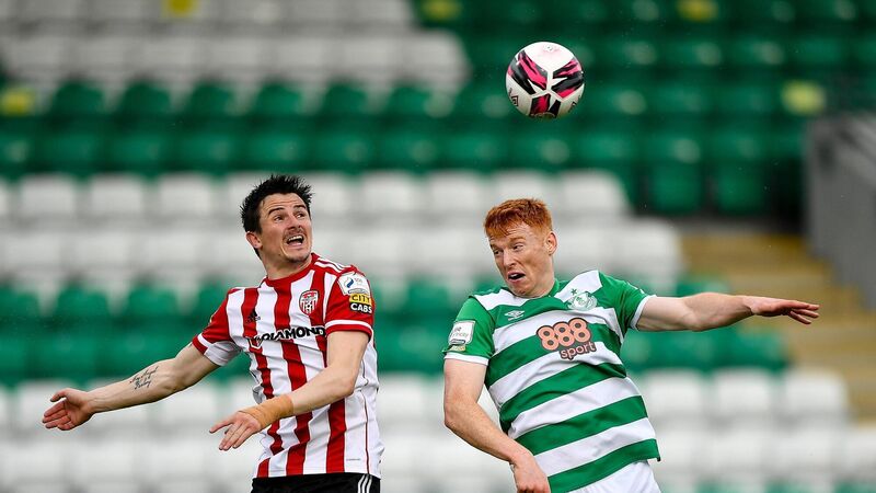 HEADLINE ACTS: Ciarán Coll of Derry City in action against Rory Gaffney of Shamrock Rovers at Tallaght Stadium