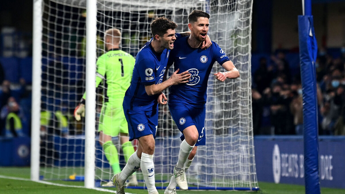 Chelsea's Jorginho (left) celebrates scoring their side's second in the win over Leicester City