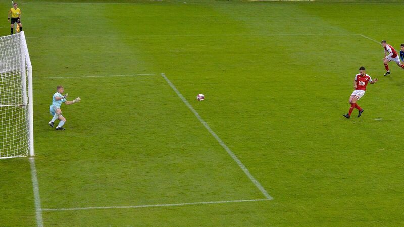 Robbie Benson of St Patrick's Athletic shoots to score his side's second goal past James Talbot of Bohemians to win the SSE Airtricity League Premier Division clash. Picture: Harry Murphy/Sportsfile