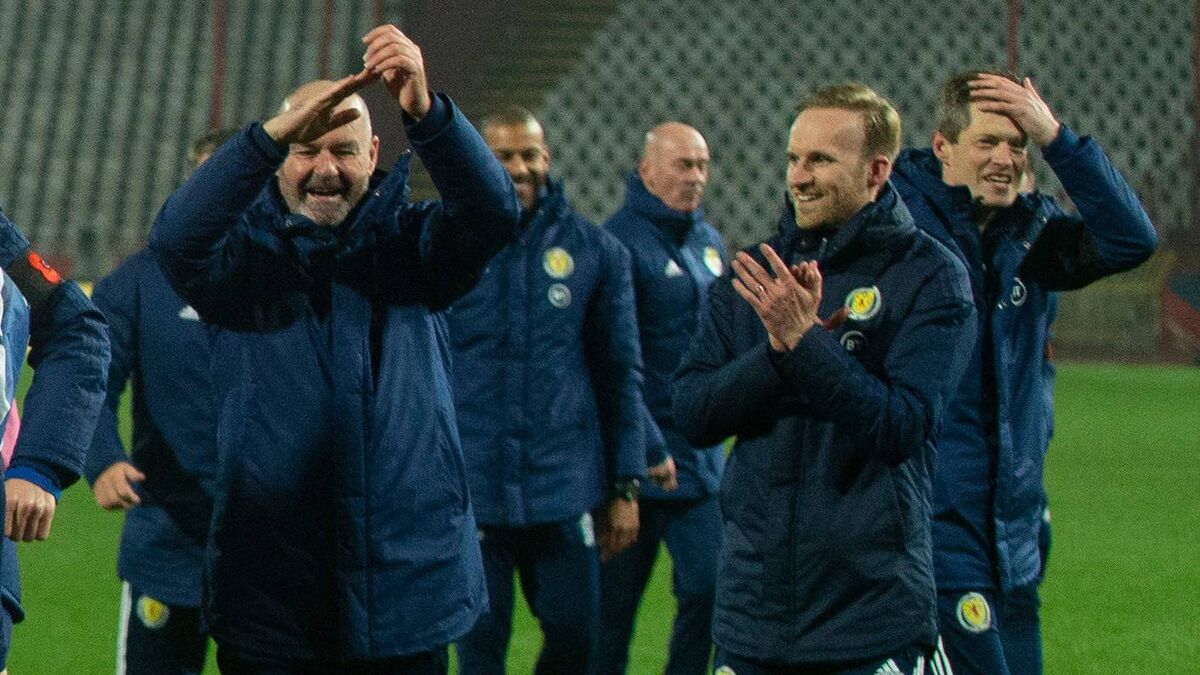 Shayne Murphy celebrating Euro playoff success with Scotland manager Steve Clarke.