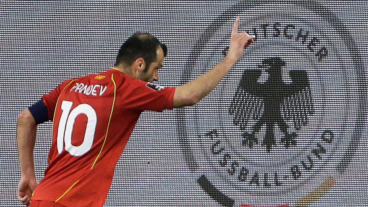 PARADISE GAINED: Veteran North Macedonia forward Goran Pandev celebrates scoring the opening goal during the 2022 World Cup qualifier against Germany. Pandev will play in his first international tournament at the age of 37.