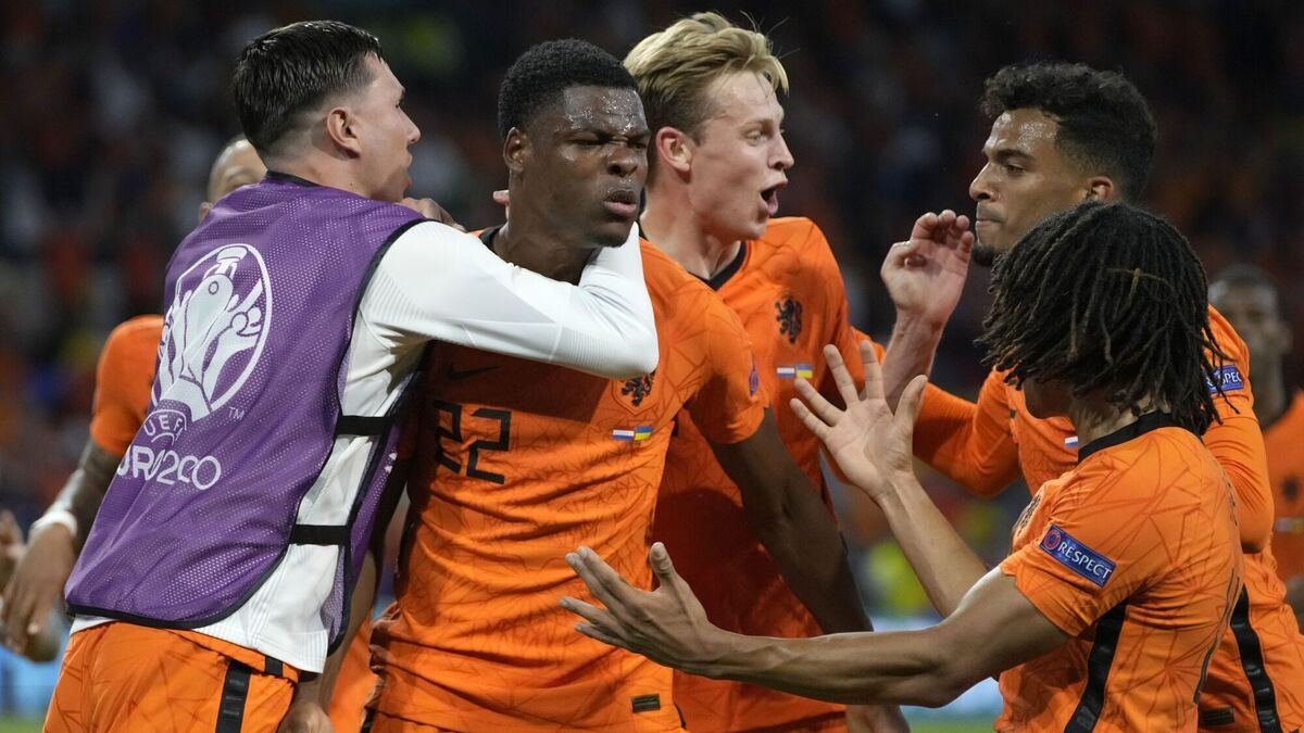 Denzel Dumfries of the Netherlands, centre, celebrates after scoring his side's third goal to seal the dramatic win. Picture: Peter Dejong