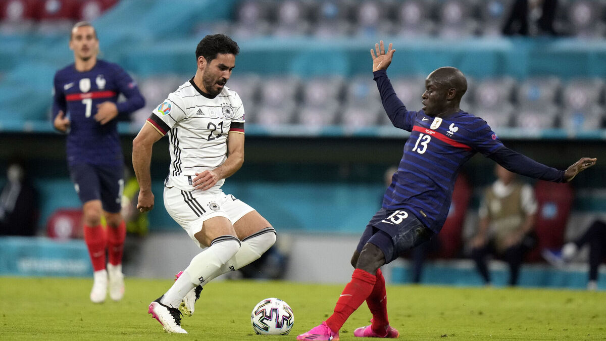 Germany's Ilkay Gundogan, left, battles for the ball with France's N'Golo Kante. Picture: AP Photo/Matthias Schrader