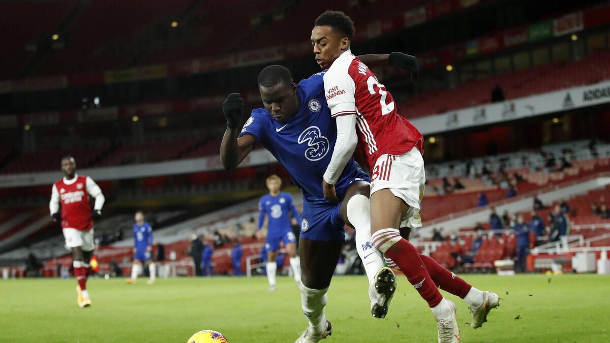 Chelsea's Kurt Zouma of Chelsea holds off Arsenals' Joe Willock last December. Where will WIllock be playng his football next season? The London rivals meet on the second weekend of the season at the Emirates.