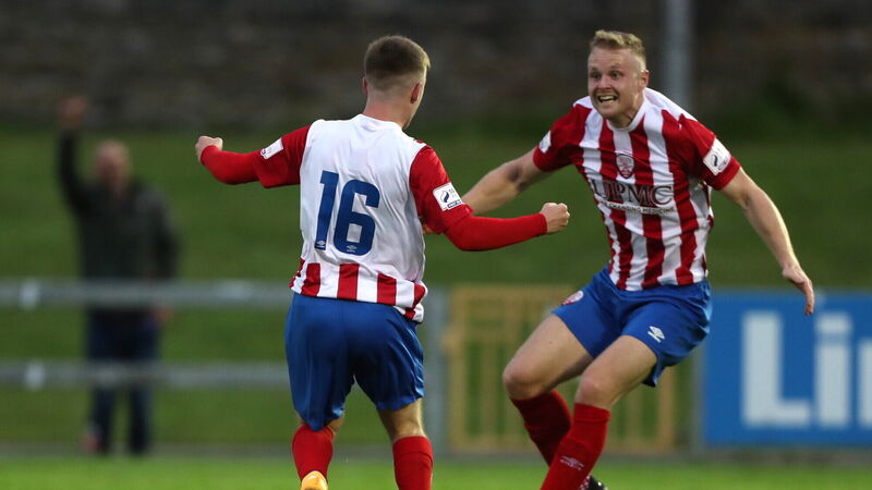 William Armshaw of Treaty United, left, celebrates after scoring. Photo by Michael P Ryan/Sportsfile