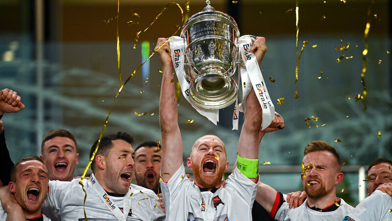 Dundalk captain Chris Shields lifts the Extra.ie FAI Cup following the final win over Shamrock Rovers last December. Picture: Eóin Noonan/Sportsfile