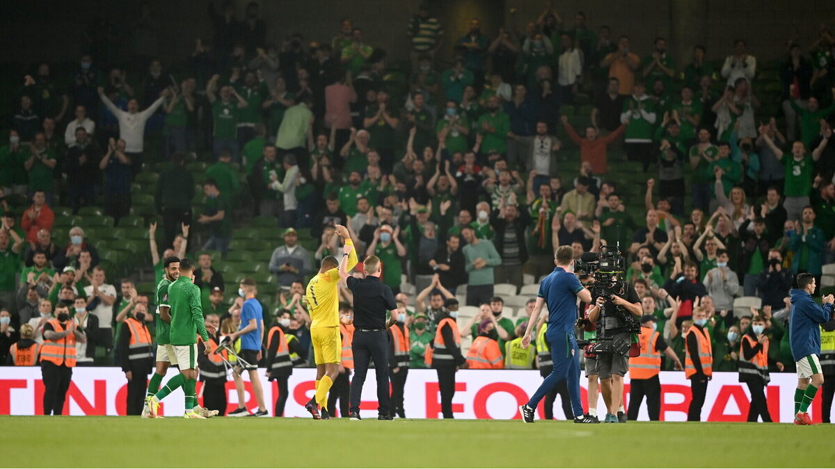 Republic of Ireland manager Stephen Kenny and Gavin Bazunu applaud the supporters after the FIFA World Cup 2022 qualifier against Serbia. Picture: Harry Murphy/Sportsfile
