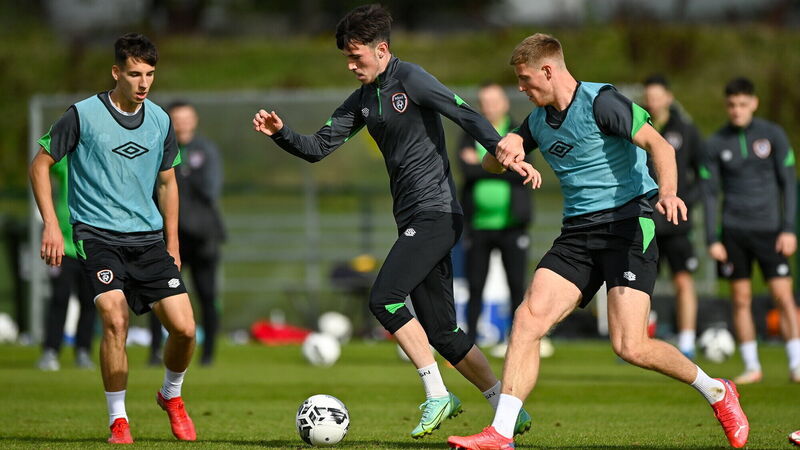 Alex Gilbert, centre, with Mark McGuinness, right, and Conor Noss during a Republic of Ireland U21 training session. Picture: Seb Daly/Sportsfile