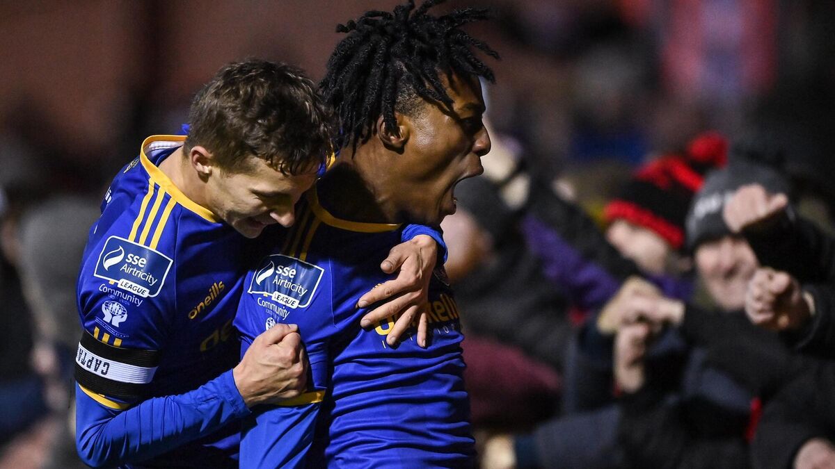 Promise Omochere of Bohemians celebrates with Tyreke Wilson, left, after scoring their side's equaliser at Richmond Park. Photo by Seb Daly/Sportsfile