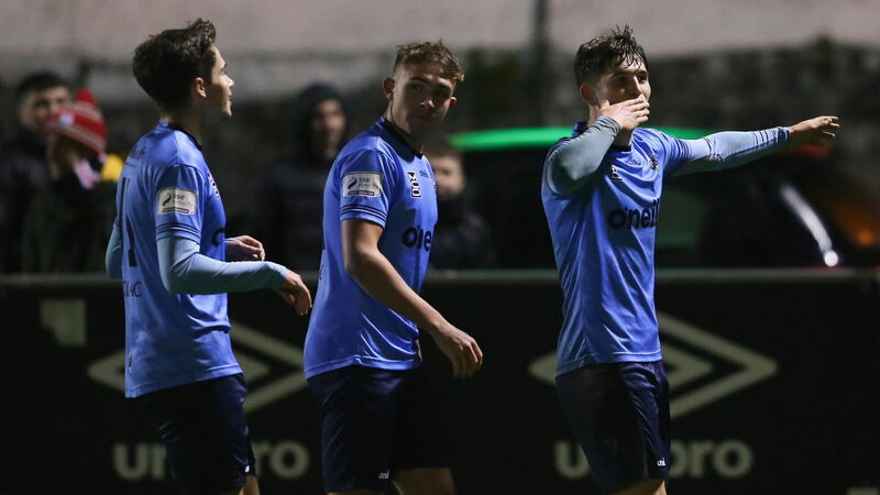 Colm Whelan of UCD, right, celebrates after scoring in the first leg