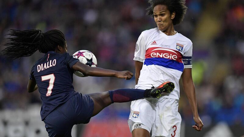 Paris Saint-Germain's French midfielder Aminata Diallo (L) vies with Lyon's French defender Wendie Renard during the a Women's Champions League matchÂ