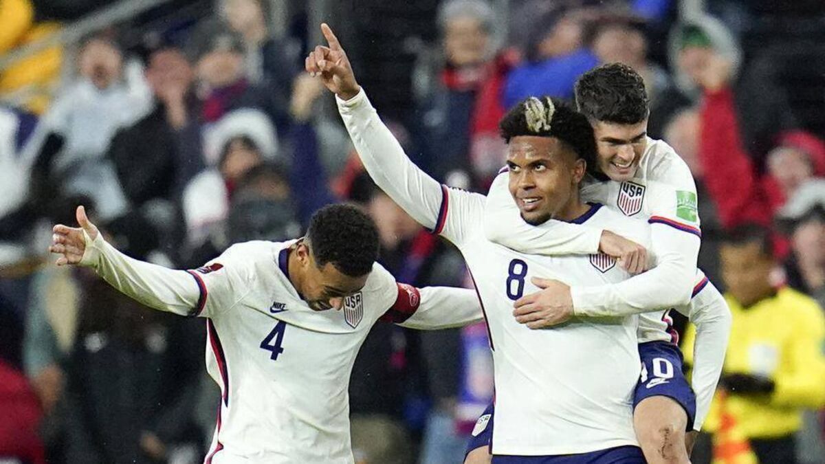 United States' Weston McKennie celebrates his goal with Tyler Adams, left, and Christian Pulisic in their 2-0 win over Mexico in Cincinnati.