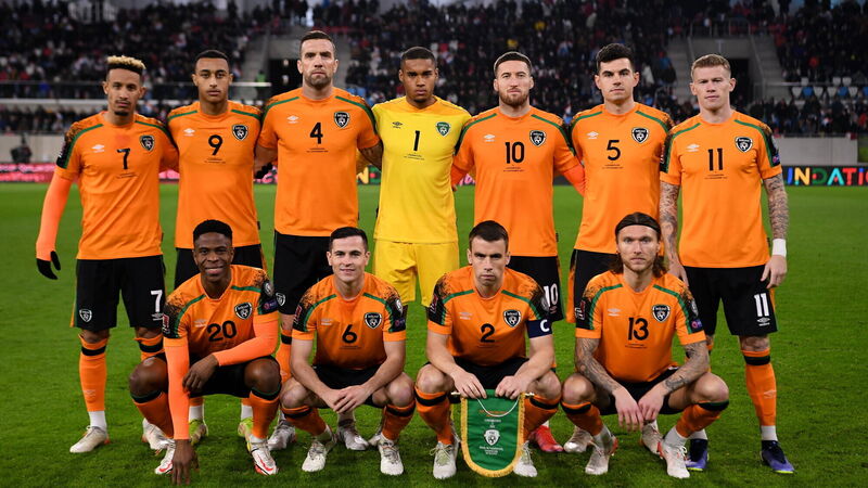 The Republic of Ireland team, back row, from left, Callum Robinson, Adam Idah, Shane Duffy, Gavin Bazunu, Matt Doherty, John Egan, James McClean, front row, from left, Chiedozie Ogbene, Josh Cullen, Seamus Coleman and Jeff Hendrick before the FIFA World Cup 2022 qualifying group A match between Luxembourg and Republic of Ireland at Stade de Luxembourg in Luxembourg. Photo by Stephen McCarthy/Sportsfile