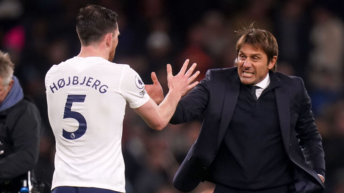 Tottenham Hotspur manager Antonio Conte (right) celebrates with Pierre-Emile Hojbjerg at the end of the Premier League match at the Tottenham Hotspur Stadium, London. Picture: Adam Davy/PA