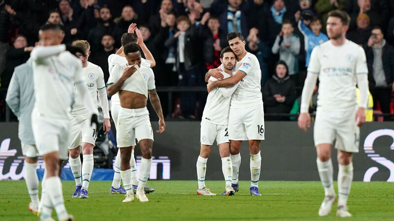 Manchester City players react after the Premier League match at Vicarage Road. Picture: Tess Derry