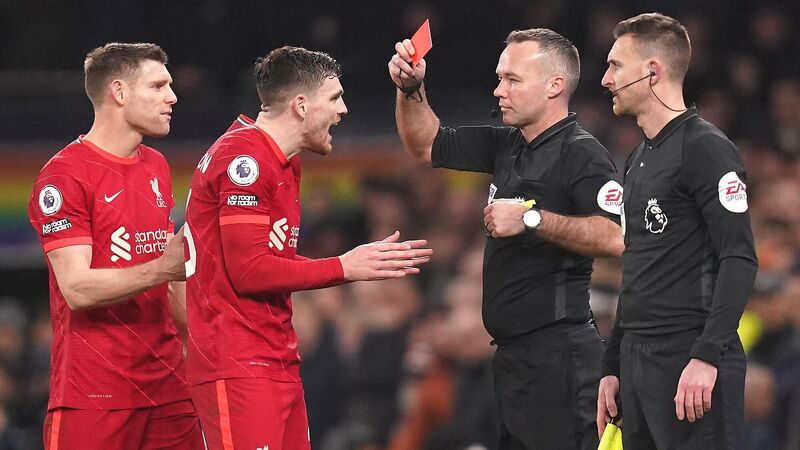 Referee Paul Tierney shows a red card to Liverpool's Andrew Robertson after a VAR review for a foul on Tottenham Hotspur's Emerson Royal during the Premier League match at the Tottenham Hotspur Stadium, London. Picture: Adam Davy/PA Wire.Â