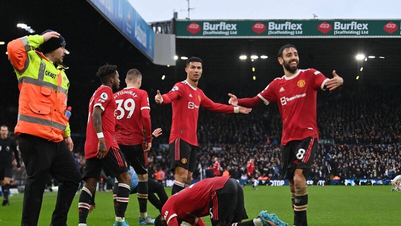 Manchester United's Anthony Elanga reacts after being hit by a coin during their clash with Leeds Utd at Elland RoadÂ