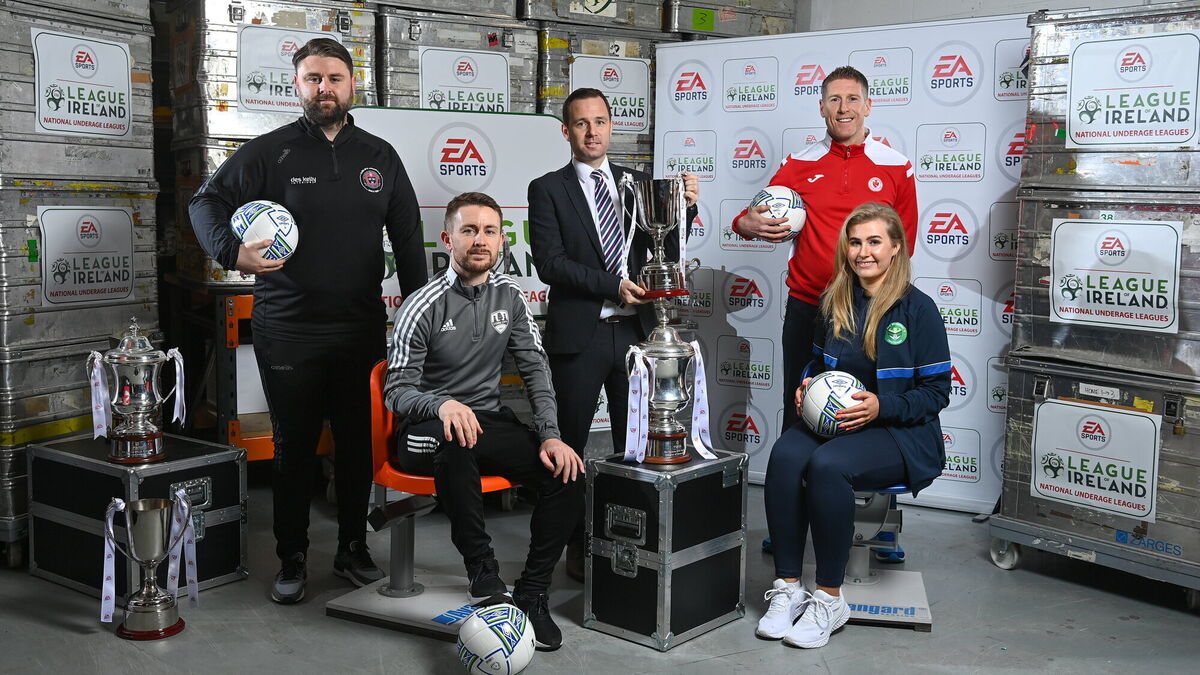23 February 2022; The EA SPORTS National Underage Leagues 2022 season launch took place today at FAI Headquarters in Abbotstown, Dublin. The new season is set to start on the week ending Sunday, March 6. Pictured are, from left, Craig Sexton, head of academy, Bohemians, Liam Kearney, head of academy, Cork City, Mark Scanlon, League of Ireland director, Conor O'Grady, head of academy, Sligo Rovers, and Isabelle Connolly, Bray Wanderers under-17 coach. Photo by Seb Daly/Sportsfile