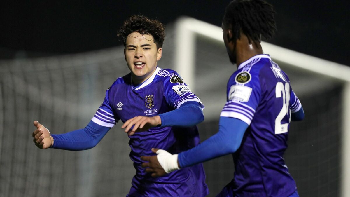 Phoenix Patterson of Waterford, left, celebrates after scoring his side's second goal against Wexford at RSC in Waterford. Picture: Michael P Ryan/Sportsfile