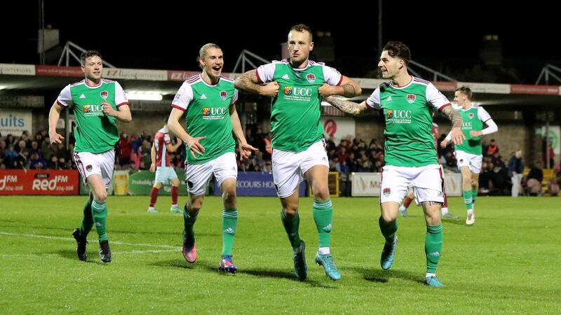 Ally Gilchrist and teammates celebrate his goal against Cobh Ramblers in last Friday night's SSE Airtricity League, Division One game at Turner's Cross.