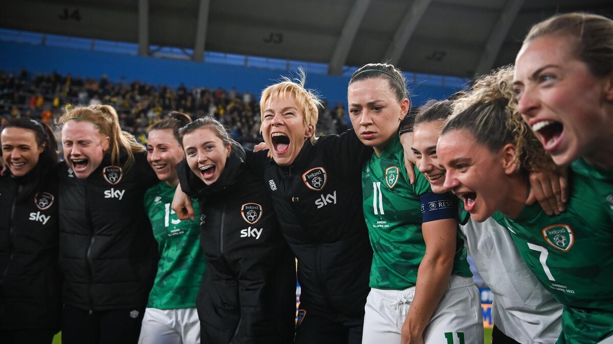 Plenty to shout about: Republic of Ireland manager Vera Pauw celebrates with her players in Gothenburg, Sweden. Picture: Stephen McCarthy/Sportsfile