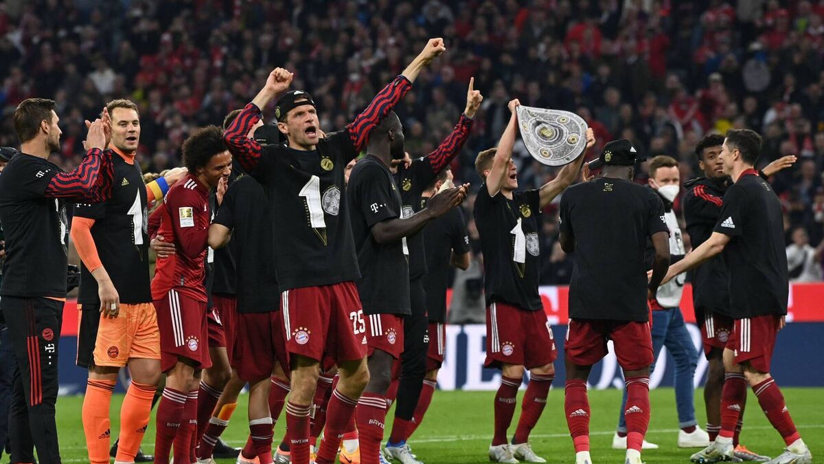 Bayern Munich players including Bayern Munich's German forward Thomas Mueller (C) celebrate after the German first division Bundesliga football match FC Bayern Munich v BVB Borussia Dortmund in Munich, southern Germany on April 23, 2022. - Bayern Munich were crowned Bundesliga champions for the 10th consecutive season on April 23, 2022 after a 3-1 home win over Borussia Dortmund in the top-of-the-table showdown. (Photo by CHRISTOF STACHE/AFP via Getty Images)