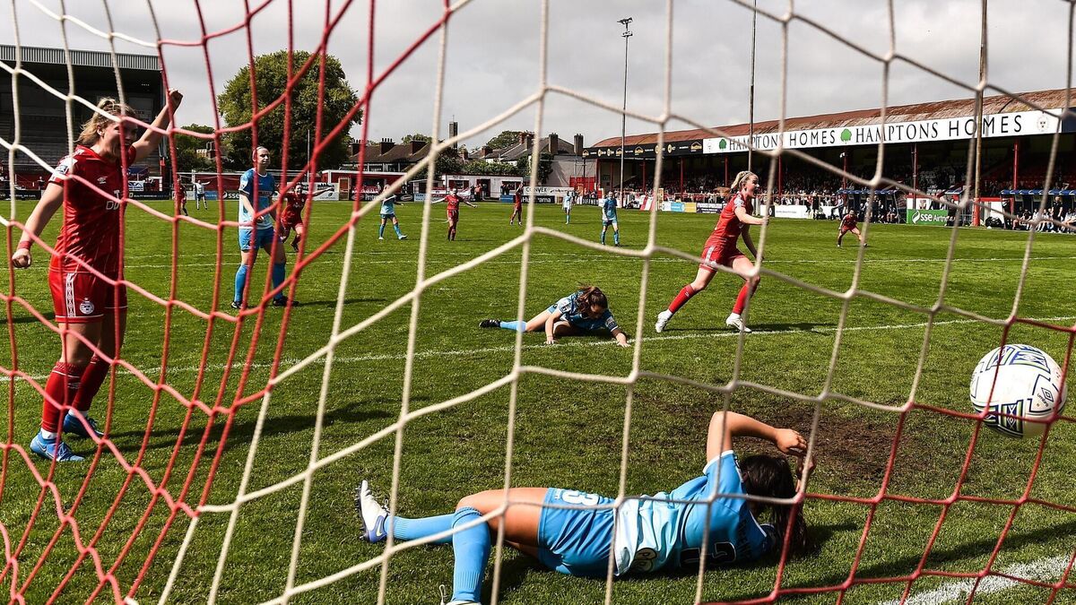 Shelbourne's Jessie Stapleton scores the only goal in the SSE Airtricity Women's National League match between Shelbourne and Peamount United at Tolka Park