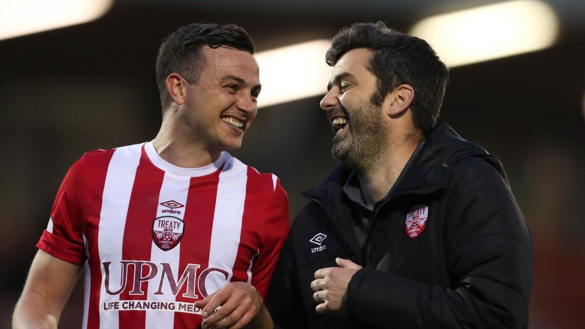 Plenty to smile about: Marc Ludden, picture with Treaty manager Tommy Barrett, grabbed a brace for the hosts against Cobh Ramblers. Pic: Michael P Ryan/Sportsfile